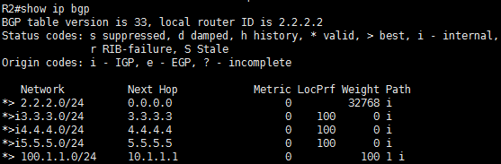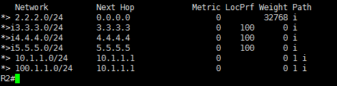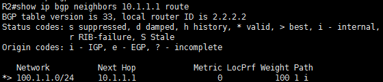 R2에서 route-map에 의해서 필터링(10.1.1.0/24) 되고 속성(weight 값이 100으로 변경 됨) 이 변경 된 정보가 보여진다.