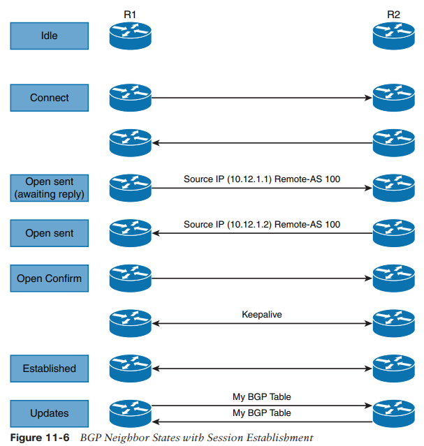 자동으로 Neighbor 관계를 맺는 IGP와 달리 BGP Neighbor는 관리자가 Neighbor 설정을 해야 Neighbor 관계를 맺습니다. Neighbor 관계 맺기 위해 TCP Port 179번을 사용하며, BGP는 finite-state machine (FSM)을 이용하여 BGP PEER와 운영 상태를 관리 합니다.