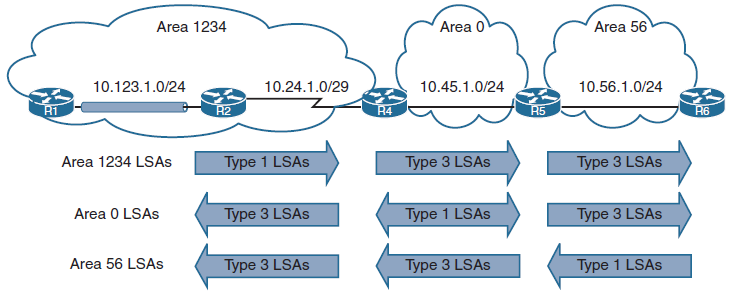 - R2 (ABR)가 ASBR의 정보가 있는 Type 4를 생성하여 전달. R1은 ASBR까지 도달하기 위한 Cost값 재계산 후 LSA Type 4 정보를 다른 Area로 전달