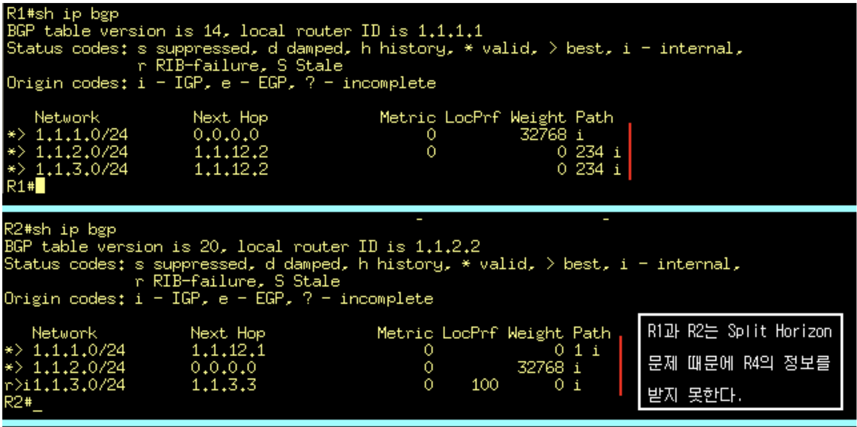 이로 인해 R4와 R5는 1.1.1.0/24 네트워크에 대해 BGP 테이블과 라우팅 테이블에 저장 시킨다.