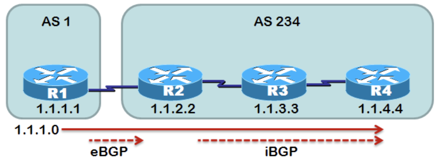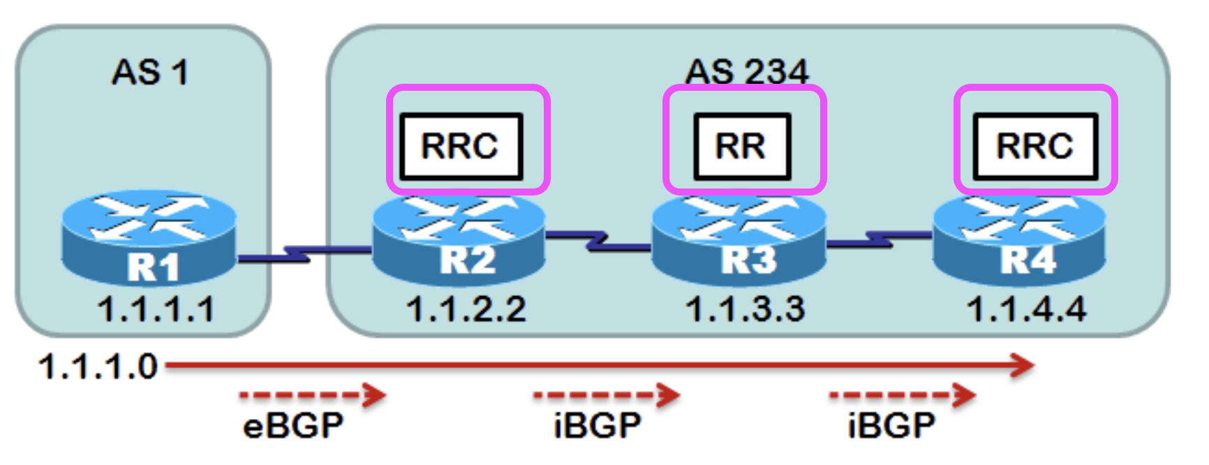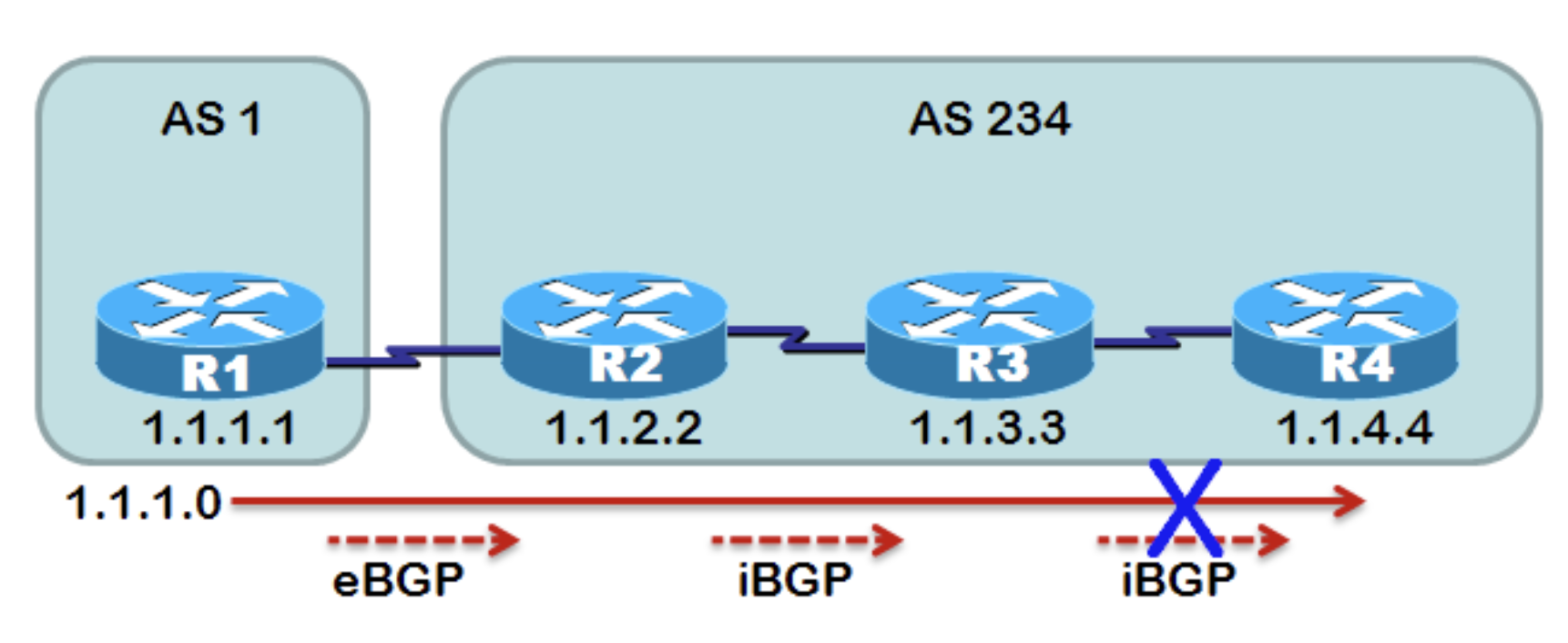 # 이렇게 되면 R2 ,R3, R4 간이 iBGP로 정보를 보내는 것이 아니라, eBGP 로 보냄으로 Synchronization 이 해결된다.